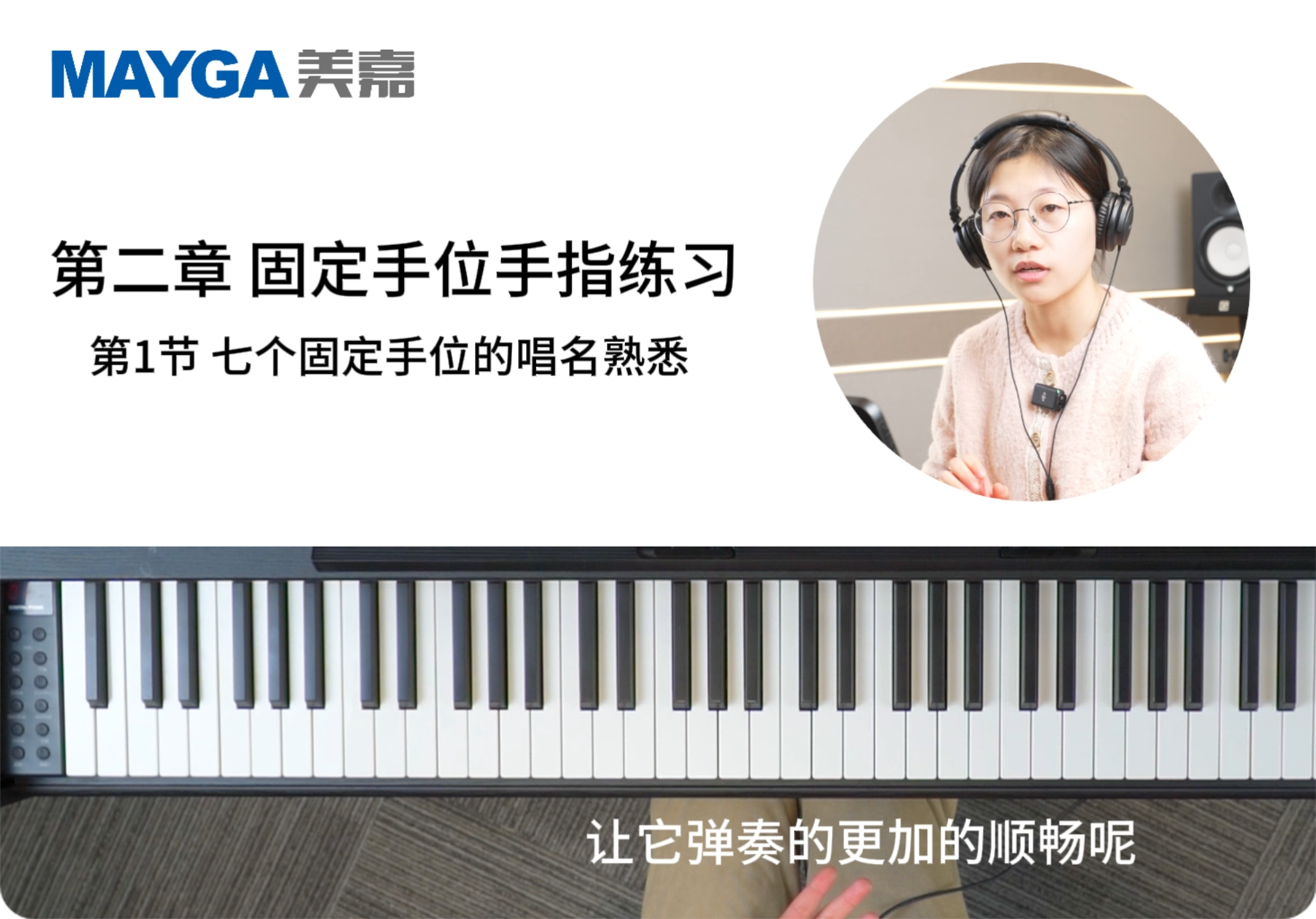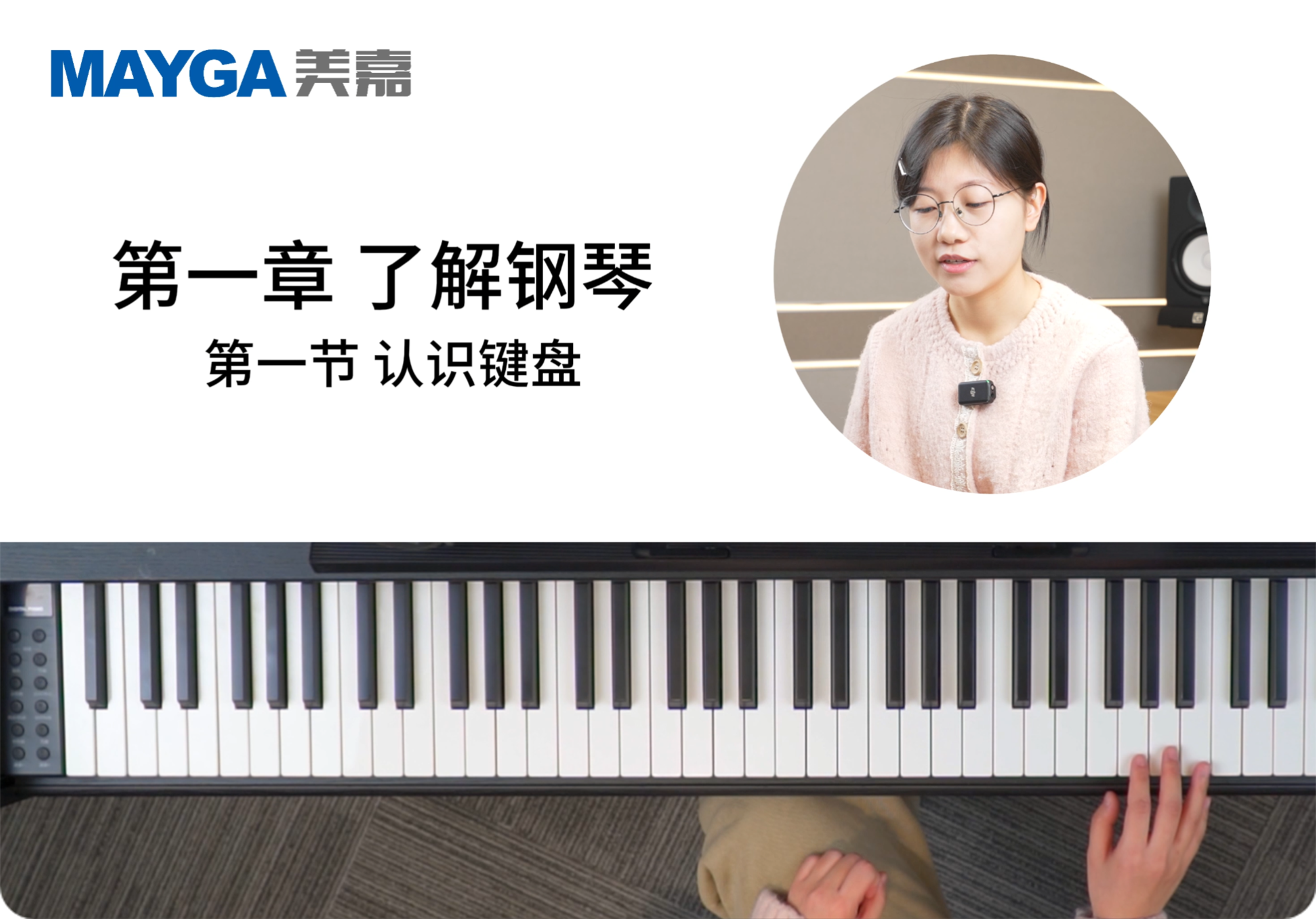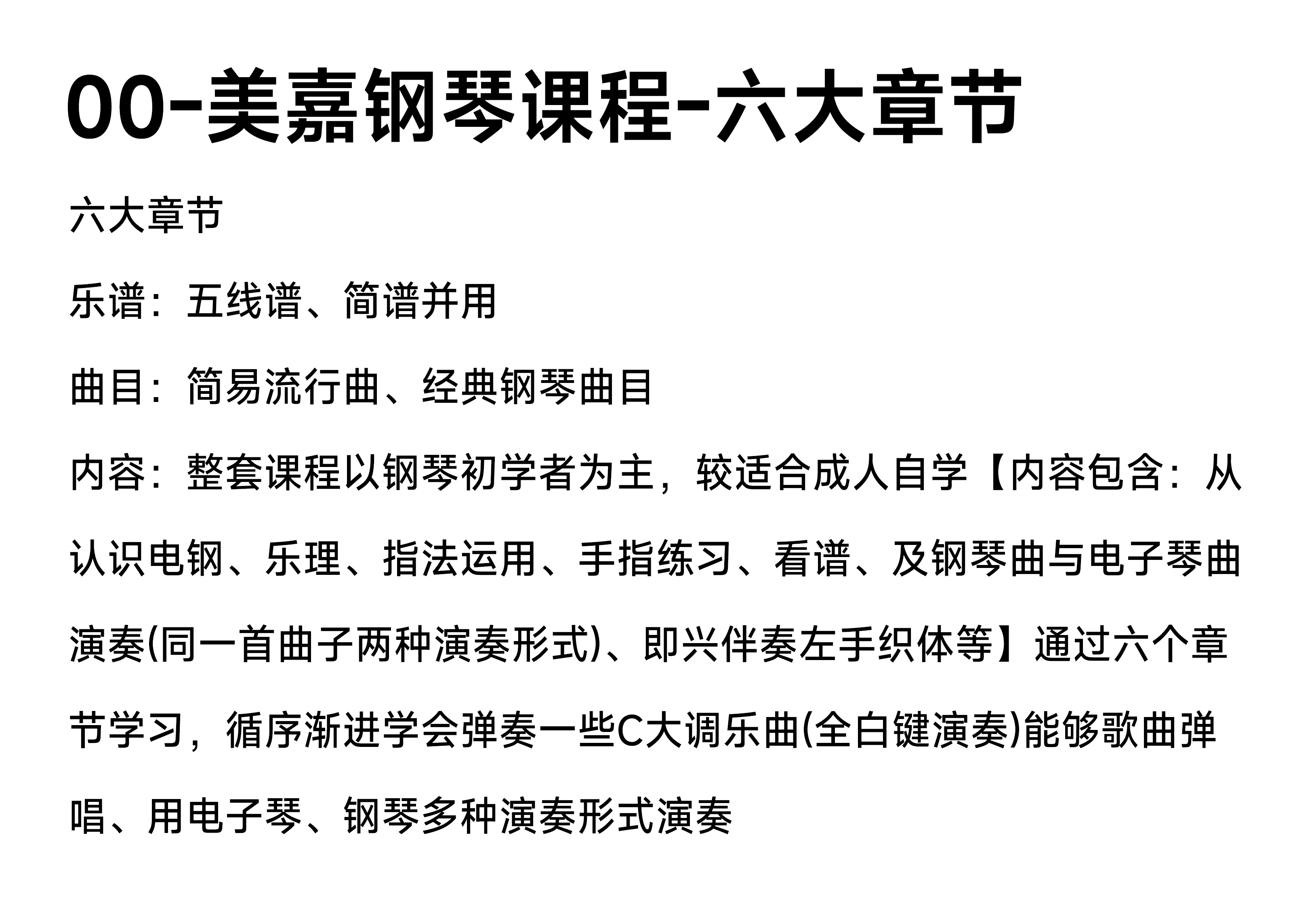 | 第三章(学会看谱及演奏 ) | 1.认识简谱、五线谱 2.《铃儿响叮当》弹奏讲解 3.《听妈妈的话》弹奏讲解 4.《茉莉花》弹奏讲解 | 第四章(和弦伴奏、和弦就近连接) | 1.三和弦及转位(大三和弦) 2.和弦就近连接练习(小三、大三和弦 ) 3.带有三连音、附点节奏型乐曲 |